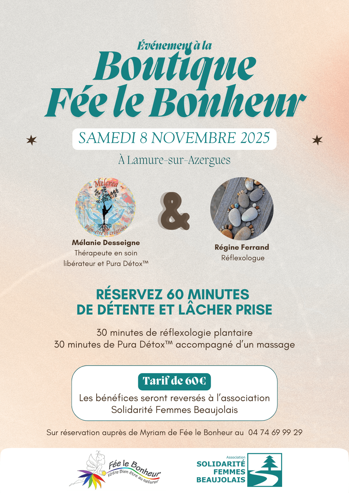 ➡️Le samedi 8 novembre, Myriam Gelay de la Boutique Fée le Bonheur, Mélanie Desseigne et Régine Ferrand organisent une journée de soins au profit de l'association 💜